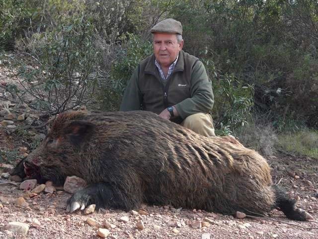 Tras llevar casi cuarenta años saliendo al campo con la ilusión de jugarme un buen lance con el marrano de nuestra vida, resulta que la Divina Providencia me lo pone a metro y medio y no soy capaz de otra cosa que largarle un tiro a tenazón sin ponerle en ningún aprieto siquiera. Y, como no venía con prisa, pues a darle más velocidad aún, para que saliera al cortadero y lo tomase como una carretera que le llevara a donde él quería llegar, que era la huida por el puesto nº 4 de la traviesa de “Forestales”. El primer tiro de mi express (no sé hoy por cuánto tiempo más y es que habrá que echarle las culpas a alguien) se lo largué, como he dicho, a través del matón de lentisco que tenía delante; esto hizo que el animal saliera del monte y me ofreciera su gran trasero y su hermoso par de cataplines… porque el animalito corría a lo largo del cortadero, cuesta abajo, buscando como decía, la fuga por el cuatro que junto al sopié cerraba la armada. No dudé, no me excité y con la tranquilidad y seguridad de echarlo abajo, le largué mi segundo expressazo para ver… queeee… seguía corriendo sin inmutarse siquiera, para asombro y desconsuelo mío. ¡No lo podía creer!, habría unos ocho metros, el cochinete debe pesar más de cien kilos y lo estaba viendo correr sin más munición en el rifle con la que corregir tan tamaño gazapo. ¡Increíble!, pero muy cierto.